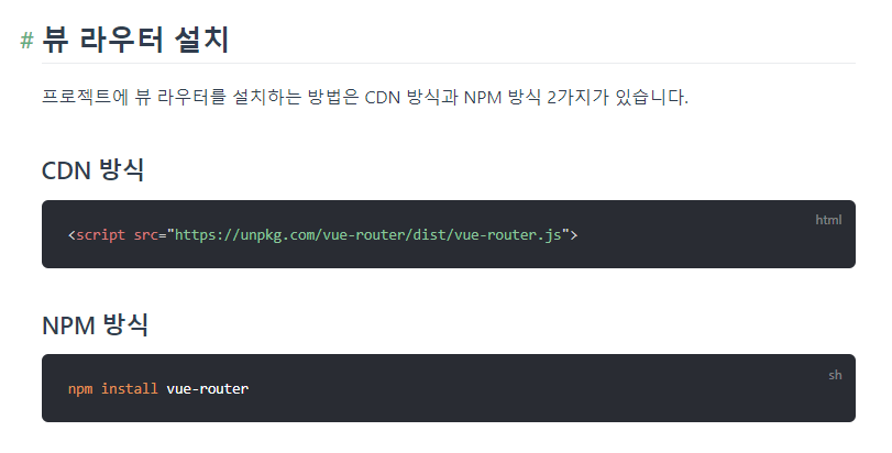 뷰 라우터 뷰 라우터는 뷰 라이브러리를 이용하여 싱글 페이지 애플리케이션을 구현할 때 사용하는 라이브러리입니다. 뷰 라우터 설치 프로젝트에 뷰 라우터를 설치하는 방법은 CDN 방식과 NPM