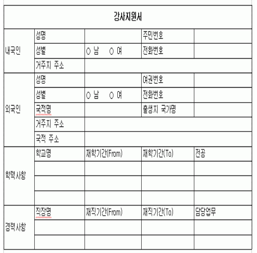 ▷ 강사정보는 아래의 강사지원서를 참고하여 등록한다. 강사지원서는 내국인용과 외국인용이 있으며, 각 강사 별로 강사번호가 부여된다.