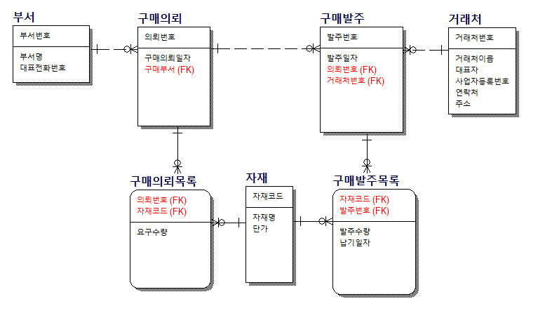 | 구매의뢰 | 1 : M | --- 필수 ---> <--- 필수 --- |