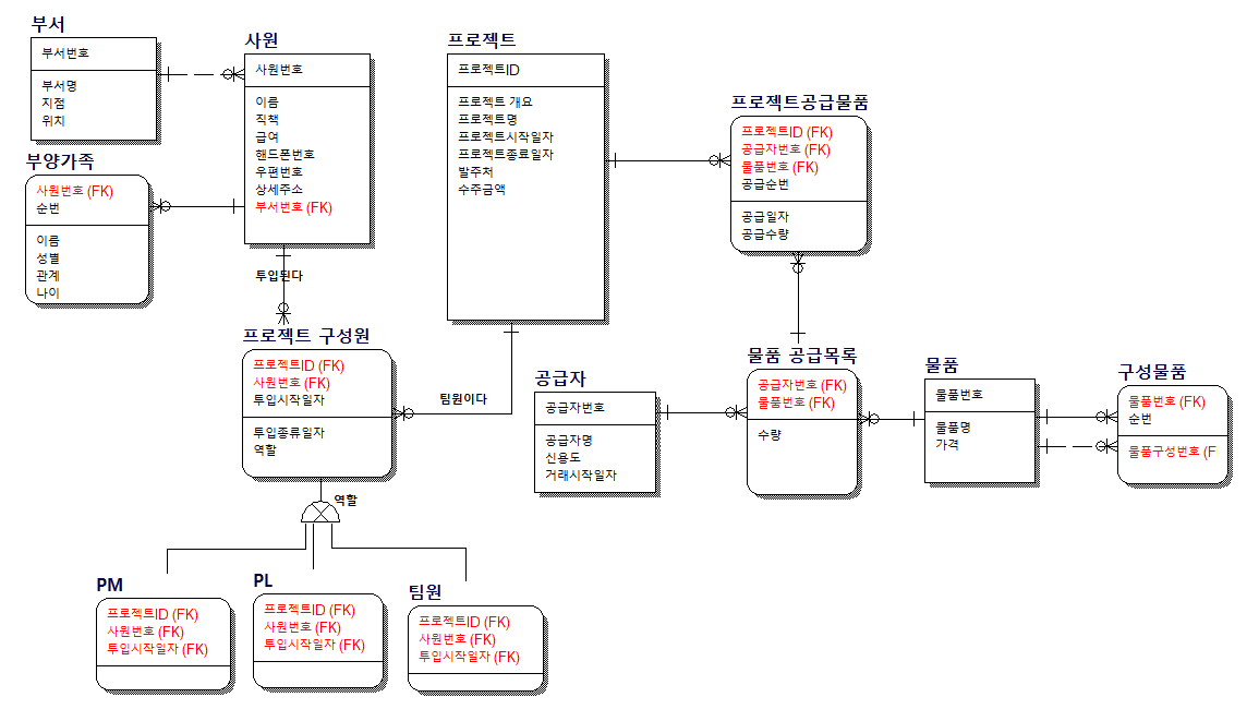 | 프로젝트 | 회사에서 수행되는 과제 | - | 프로젝트ID, 프로젝트명, 발주처, 프로젝트 기간(시작/종료일), 수주금액, 프로젝트 개요 | |