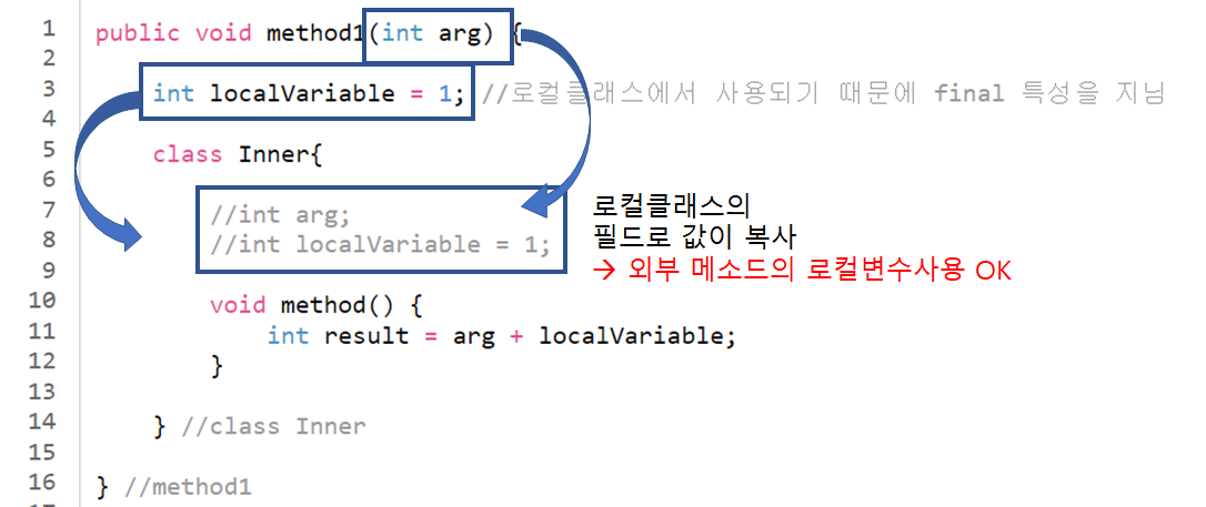 => 문제 해결 : 생명주기가 짧은 변수를 final 상수로 만들어 메소드 영역에 있는 Clazz객체의 상수풀에 넣음!!!